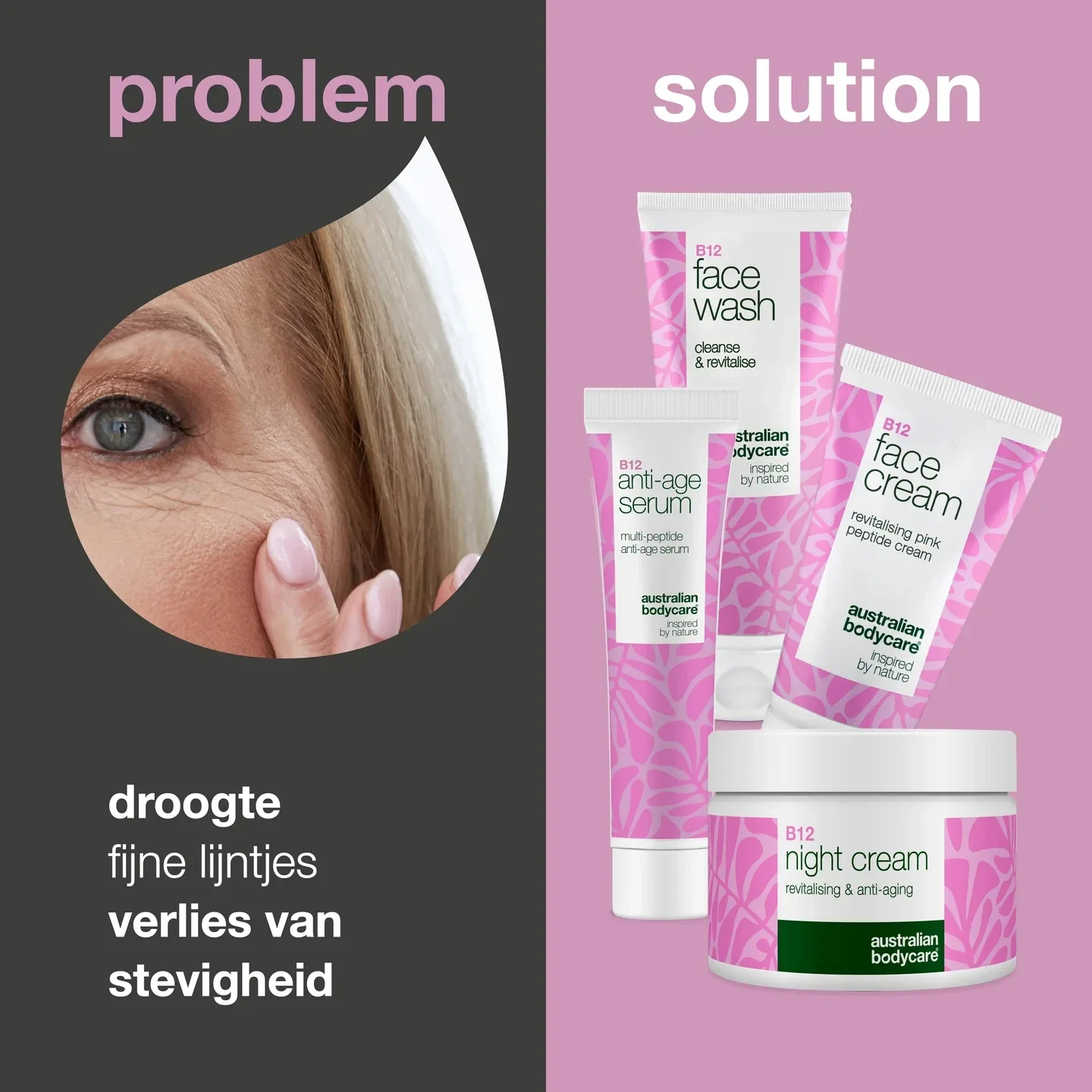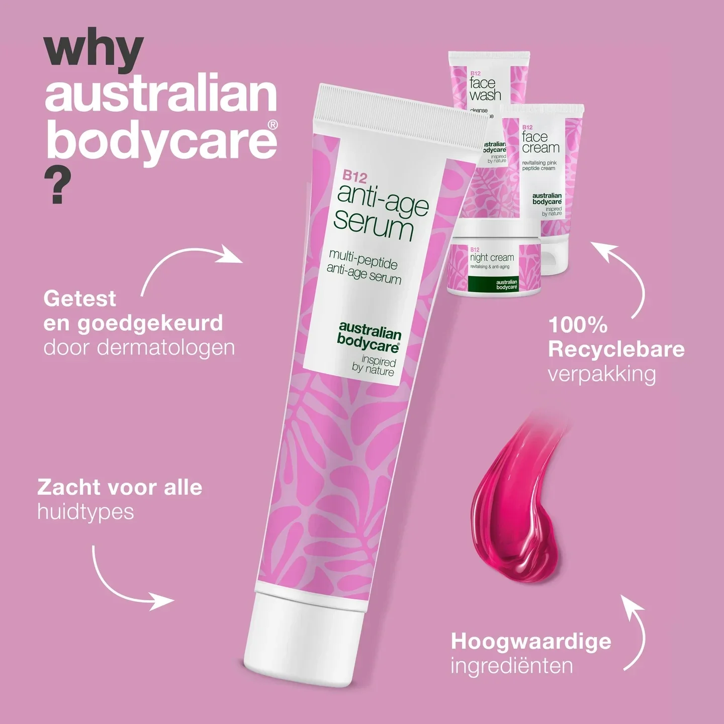 Ben je op zoek naar gerichte huidverzorging die rijpere huid verstevigt en voedt? Dan is onze B12 Huidverzorgingsset precies wat je nodig hebt. Deze exclusieve collectie van Australian Bodycare bevat een gezichtsreiniger, serum, dagcrème en nachtcrème, speciaal ontwikkeld om rijpere huid te verzorgen en te versterken. Verrijkt met krachtige ingrediënten zoals vitamine B12, niacinamide, ectoïne en allantoïne, werkt deze set intensief om je een gladdere en stralendere huid te geven.